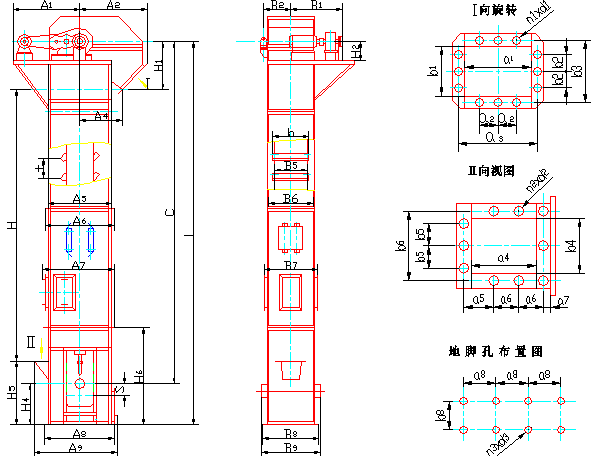 提升機(jī) | 輪廓高度 | 正機(jī)結(jié)構(gòu)尺寸 | 料斗 | 地角孔尺寸 | ||||||