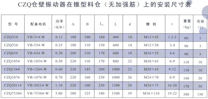 CZQ倉壁振動器是一種以振動電機為激振源的一種新型防閉塞裝置,將該裝置安裝于各種料倉上,通過振動可使料倉中結拱的物料發(fā)生變位運動,從而起到解拱作用。