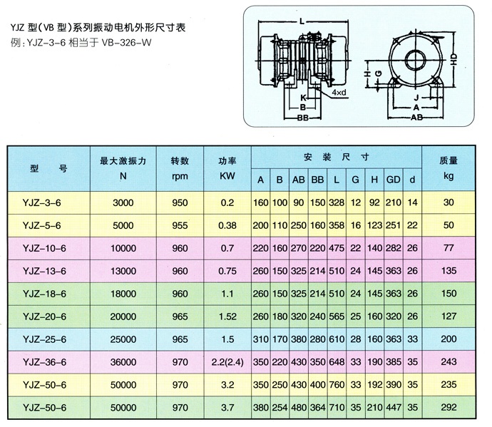 YJZ是我廠在VB系列振動(dòng)電機(jī)基礎(chǔ)上的又一新型產(chǎn)品,YJZ系列振動(dòng)電機(jī)和VB系列振動(dòng)電機(jī)地腳安裝尺寸基本相似,但是外形尺寸稍有不同??蛻粼谶x購(gòu)的時(shí)候也可以互相參考。