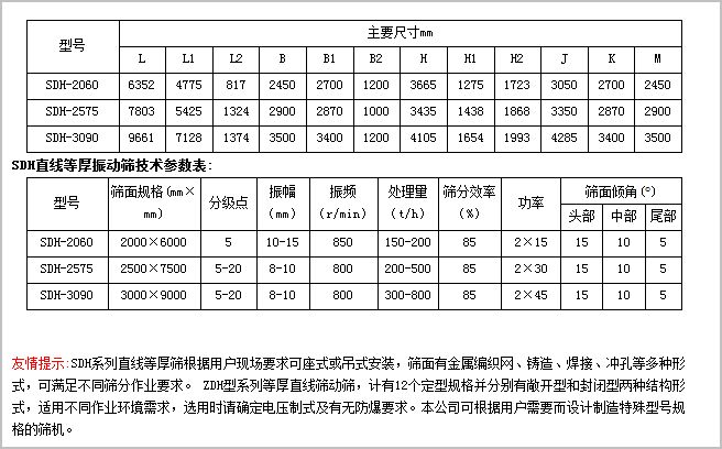 SDH型直線等厚振動篩是一種直線振動篩,廣泛適用于煤碳、冶金、礦山、電力、建材、輕工和化工等行業(yè)對各種顆粒狀和小塊狀松散固體物料的干式分級。SDH直線等厚振動篩機面由不同傾角的多區(qū)段(一般為三段)組成,使篩分物料在各區(qū)段呈近似等厚分布,有利于物料在篩面上的輸送、分層和透篩。