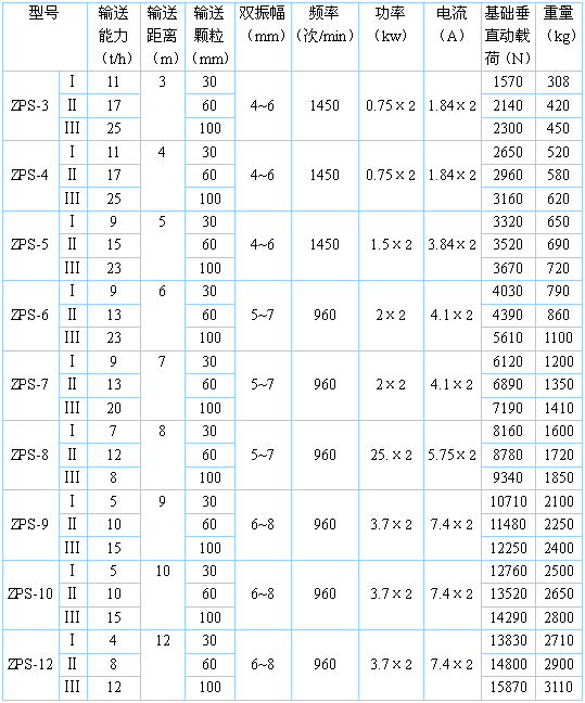 ZPS型電機振動水平輸送機主要技術(shù)參數(shù)