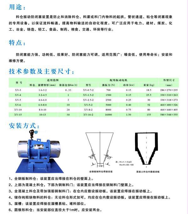 XV系列倉壁振動器(防閉塞裝置)無論任何安裝方式,只要是在料倉兩側(cè)安裝本裝置,應(yīng)保證兩臺設(shè)備相差50MM--100MM的水平高度,否則易形成共振區(qū),設(shè)備難以發(fā)揮作用。